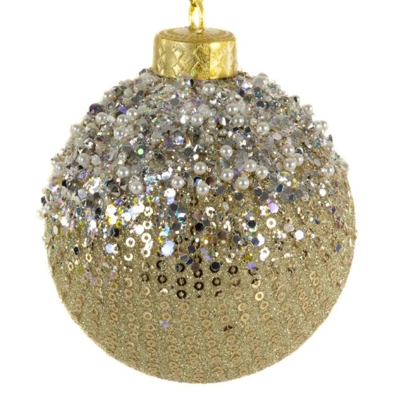 Bombka plastikowa pokryta brokatem zdobiona perełkami i cekinami kolor: złoty, Skład: tworzywo sztuczne
