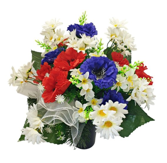 Kompozycje nagrobne z obciążeniem z wysokiej jakości sztucznych kwiatów i roślin.