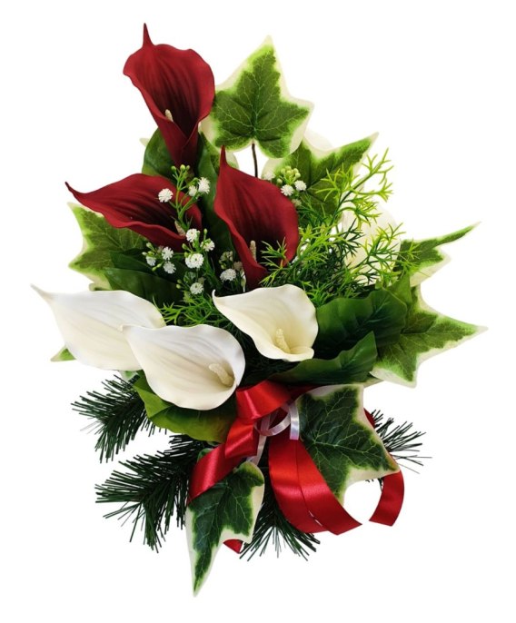 Stroik cechuje się unikalną kompozycją sztucznych kwiatów. Starannie dobrane kwiaty są niezwykle realistyczne, dodając wiązance autentyczności i podkreślając jej uroczysty charakter. Ten produkt jest idealny jako element dekoracji grobu, łącząc szacunek i elegancję w jednym, starannie wykonanym projekcie.