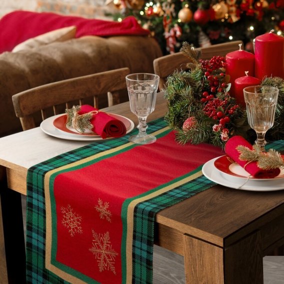 Bieżnik na stół zielono, czerwony 45x140 cm gobelinowy STAR z motywem złotych śnieżynek i ozdobnej kantą kraty