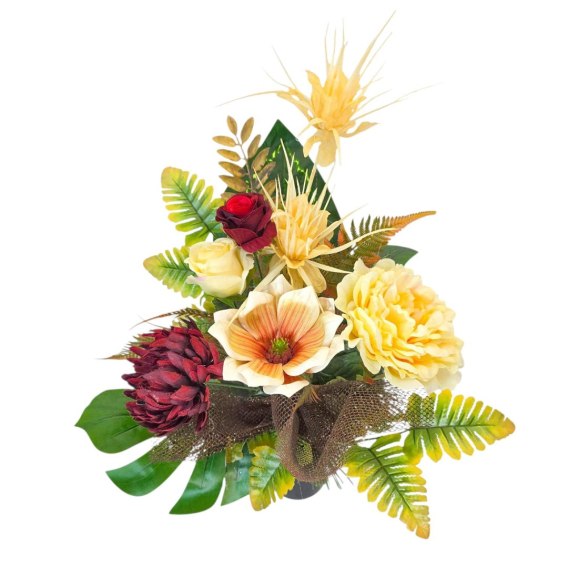 Stroik cechuje się unikalną kompozycją sztucznych kwiatów. Starannie dobrane kwiaty są niezwykle realistyczne, dodając wiązance autentyczności i podkreślając jej uroczysty charakter.