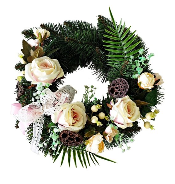 Odporność na warunki atmosferyczne: Wieniec jest odporny na wszelkie warunki atmosferyczne, co pozwala na zachowanie jego uroku przez długi czas, niezależnie od warunków pogodowych.