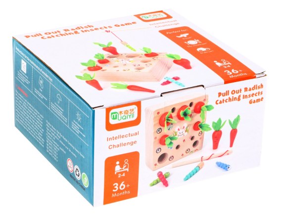 Zabawka przeznaczona jest dla dzieci od 3-go roku życia. Wykonana została w całości z drewna, pomalowana bezpiecznymi, nietoksycznymi farbami w żywych kolorach, które przyciągają uwagę dziecka i zachęcają do zabawy. Gra wspiera rozwój intelektualny i zręcznościowy. Dziecko musi dopasować różnej wielkości marchewki i robaczki do odpowiednich otworów. Robaczki zakończone są  magnesami, a do zestawu dołączona jest drewniana wędka również z magnesem. Grać można samemu lub w grupie. Należy usunąć wszystkie robaczki za pomocą wędki, tak by nie zagrażały rosnącym marchewkom, a potem pozbierać marchewki.