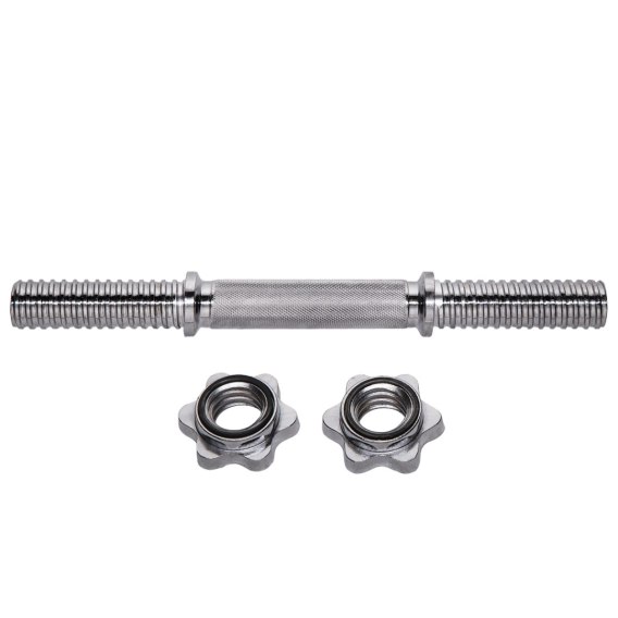 Gryf prosty - 35cm na zaciski gwiazdowe. Aby zapewnić pewne i wygodne trzymanie, część chwytna gryfu jest starannie radelkowana. W zestawie znajdują się dwa zaciski śrubowe. Zaciski tego typu gwarantują w czasie wykonywania ćwiczeń stabilne położenie ciężar na gryfie. Nakrętki posiadają w części wewnętrznej gumowe uszczelki, zapobiegające luzowaniu się obciążenia. Część gryfu jest gwintowana, co pozwala na szybkie i bezpieczne umieszczanie obciążenia. Gryf wykonywany jest z pełnego pręta stalowego, który poddany został procesowi hartowania. Średnica gryfu 30 milimetrów zapewnia dużą wytrzymałość oraz komfort ćwiczenia. Zastosowany proces chromowania gryfu jest gwarancją zachowania jego wyglądu przez bardzo długi okres użytkowania, oraz stanowi najlepsze zabezpieczenie przed rdzą.