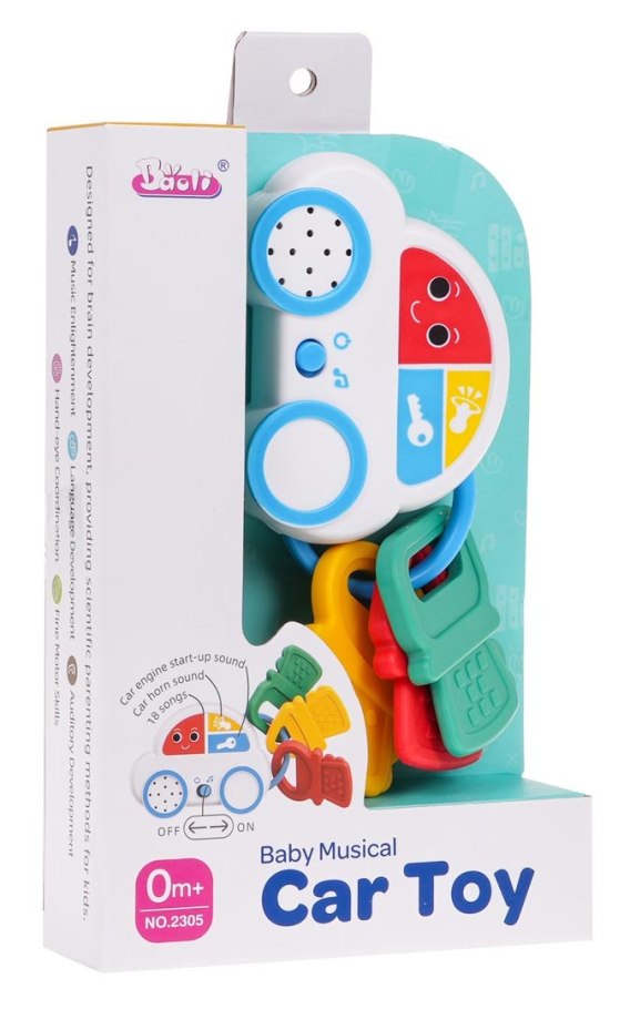 Interaktywne autko z kluczykami dla maluchów od 6-go miesiąca życia. Zabawka wykonana została z najlepszej jakości plastiku w żywych kolorach. Nie posiada ostrych zakończeń, jest w pełni bezpieczna dla maluszka. Kluczyki dołączone do autka mogą pełnić funkcję gryzaka. Autko zasilane jest bateriami typu 3 x AAA 1,5 V (brak w zestawie). Po naciśnięciu przez dziecko na przycisk z kluczem usłyszymy odgłos uruchamiania samochodu. Przycisk z klaksonem uruchamia odgłos klaksonu, a pod przyciskiem z buźką, kryje się 18 melodii.