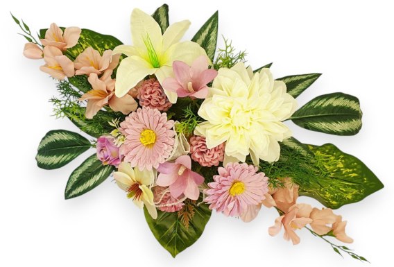 Kompozycje nagrobne z obciążeniem z wysokiej jakości sztucznych kwiatów i roślin.