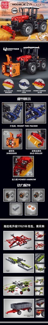 Wysokiej jakości klocki konstrukcyjne dla dzieci od czternastego roku życia. Zestaw składa się z 2716 elementów, z których zbudować można zdalnie sterowany czerwony traktor z wymiennymi elementami - brona, kruszarka, prasa, wał. Traktor posiada wiele ruchomych części takich jak klapa silnika, ramiona prasy oraz zdalnie sterowane elementy - koła zębate kruszarki, podwozie brony. Gumowe duże koła zapewniają ciągnikowi stabilną jazdę w każdym kierunku. Model możemy sterować za pomocą pilota lub aplikacji pobranej na smartfonie. Kod dostępu znajduje się na opakowaniu. Aplikacja umożliwia dostęp do wielu funkcji takich jak poruszanie pojazdem, ruch akcesoriami czy też planowanie tras przejazdu poprzez proste zaprogramowanie. Traktor zasilany jest akumulatorem typu 7,4V (w zestawie), pilot bateriami typu 2 x AAA 1,5V (brak w zestawie).
