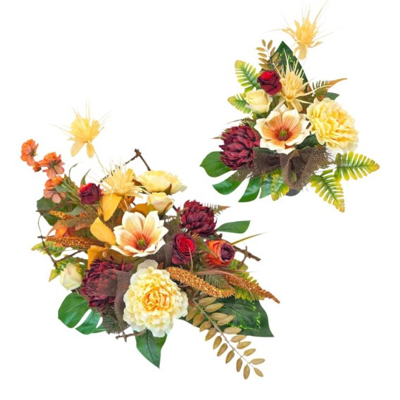 Ten komplet został przygotowany z myślą o spójnej i eleganckiej dekoracji nagrobka. Stroik i bukiet tworzą harmonijną całość, która w piękny sposób podkreśli pamięć o bliskich, zapewniając uroczysty i zadbany wygląd pomnika.