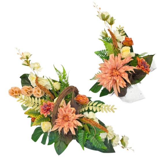 Ten komplet został przygotowany z myślą o spójnej i eleganckiej dekoracji nagrobka. Stroik i bukiet tworzą harmonijną całość, która w piękny sposób podkreśli pamięć o bliskich, zapewniając uroczysty i zadbany wygląd pomnika.