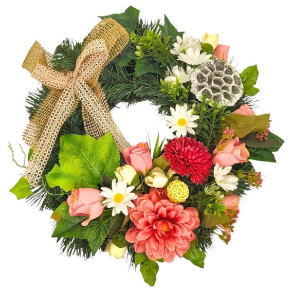 Realistyczne i naturalne kwiaty: Nasz stroik zawiera unikalną kompozycję kwiatów, które wyglądają naturalnie i realistycznie, dodając autentyczności oraz elegancji.
