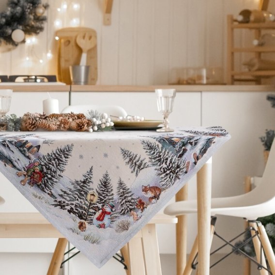 Obrus naturalno, srebrny 140x180 cm gobelinowy z mieszanki włókien z wzorem zimowego miasteczka