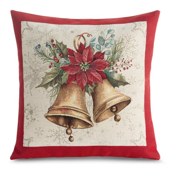 Poszewka na poduszkę 45x45 cm gobelinowa naturalno, czerwona zdobiona motywem dzwoneczków GOB