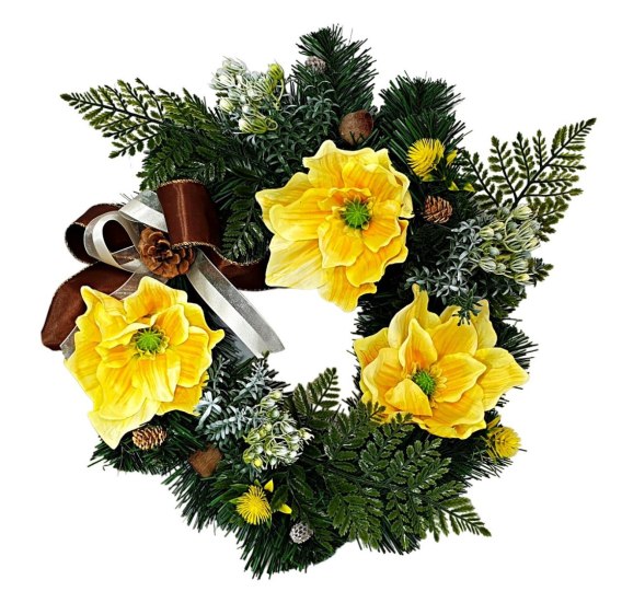 Realistyczne i naturalne kwiaty: Nasz stroik zawiera unikalną kompozycję kwiatów, które wyglądają naturalnie i realistycznie, dodając autentyczności oraz elegancji.