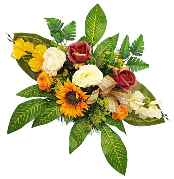 Stroik cechuje się unikalną kompozycją sztucznych kwiatów. Starannie dobrane kwiaty są niezwykle realistyczne i naturalne, dodając wiązance autentyczności i podkreślając jej uroczysty charakter. Ten produkt jest idealny jako element dekoracji grobu, łącząc szacunek i elegancję w jednym, starannie wykonanym projekcie.