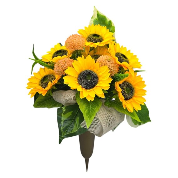 Estetyczny i trwały bukiet sztucznych kwiatów przeznaczony do wbijania w ziemię. Kompozycja oparta na wyrazistych, żółtych słonecznikach została wzbogacona pomarańczowymi kulistymi kwiatami oraz dekoracyjną zielenią. Całość umieszczona jest w wazonie na stabilnym plastikowym szpikulcu, co ułatwia umiejscowienie bukietu przy grobie, kapliczce lub krzyżu. Wazon jest obciążony betonem. Naturalny wygląd kwiatów oraz gustowny dodatek w postaci jutowej wstążki sprawiają, że dekoracja prezentuje się elegancko i schludnie przez długi czas - niezależnie od warunków atmosferycznych.