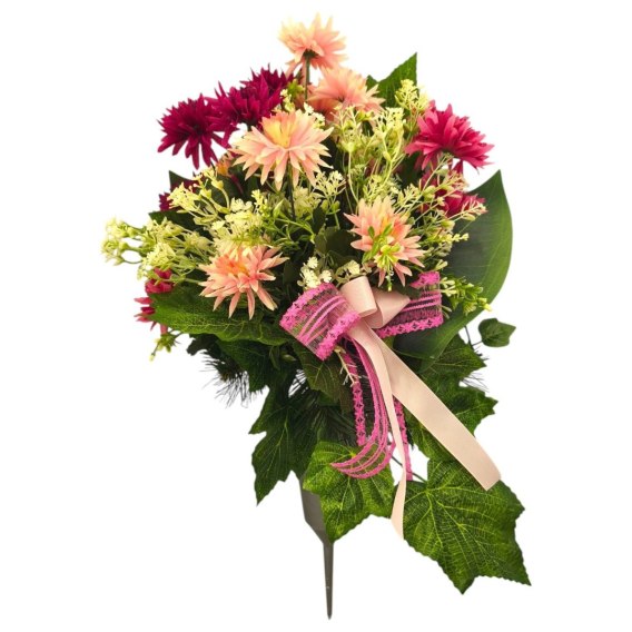Estetyczny i trwały bukiet sztucznych kwiatów przeznaczony do wbijania w ziemię. Kompozycja umieszczona jest w wazonie na stabilnym plastikowym szpikulcu, co ułatwia umiejscowienie bukietu przy grobie, kapliczce lub krzyżu. Wazon jest obciążony betonem. Naturalny wygląd kwiatów oraz gustowny dodatek w postaci wstążki sprawiają, że dekoracja prezentuje się elegancko i schludnie przez długi czas - niezależnie od warunków atmosferycznych.