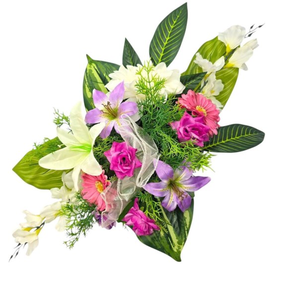 Kompozycje nagrobne z obciążeniem z wysokiej jakości sztucznych kwiatów i roślin.
