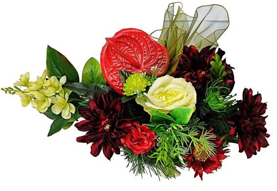 Kompozycje nagrobne z obciążeniem z wysokiej jakości sztucznych kwiatów i roślin.