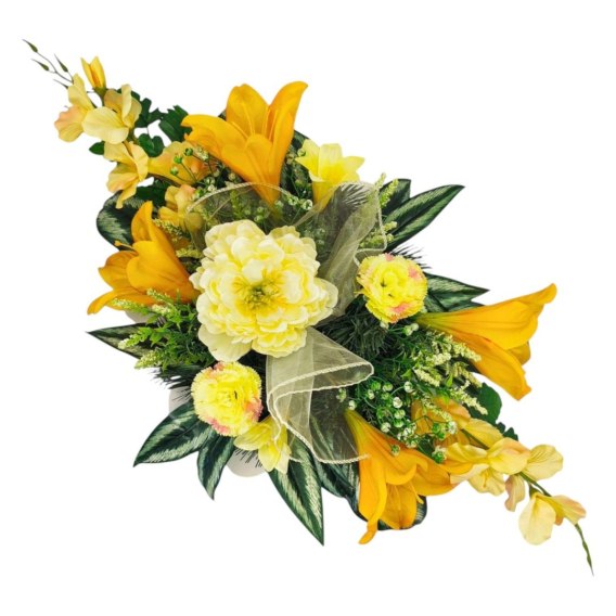 Kompozycje nagrobne z obciążeniem z wysokiej jakości sztucznych kwiatów i roślin.