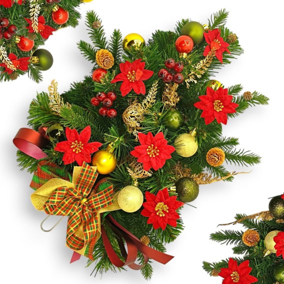 Przedstawiamy przepiękny Stroik Świąteczny - wyjątkową dekorację bożonarodzeniową, która wprowadzi świąteczną atmosferę w każdą przestrzeń! Wykonany z realistycznego igliwia, zdobiony eleganckimi bombkami, naturalnymi szyszkami, złotą kokardą oraz kwiatem gwiazdy betlejemskiej w złotym blasku. Całość uzupełniają starannie dobrane dodatki, które nadają stroikowi niepowtarzalnego uroku.