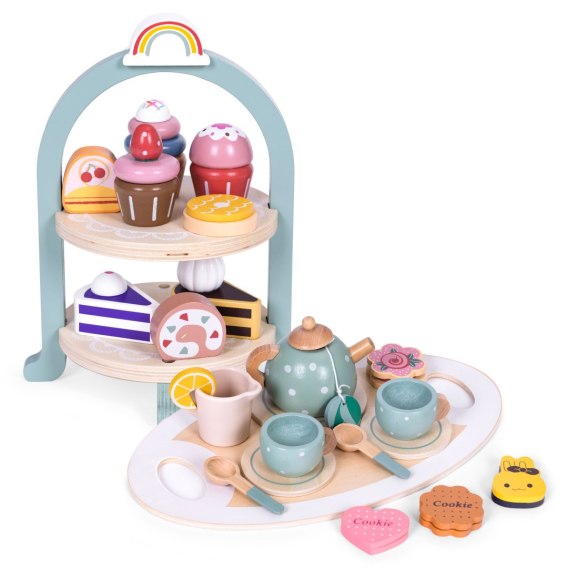 Ten zestaw przeniesie wszystkie dzieci w świat dorosłych i pozwoli na fantastyczną zabawę, w której może uczestniczyć cała rodzina. Zestaw zawiera wszystko to, co jest potrzebne do zorganizowania wyjątkowego popołudnia: dzbanek, filiżanki, talerzyki oraz praktyczną tackę. Ponieważ spotkanie przy herbacie, czy kawie nie może obejść się bez słodkości, dodatkowymi elementami zestawu są kolorowe, ciastka, torciki i babeczki, które zachwycają swoim realistycznym wyglądem. Dzięki tym kolorowym zabawkom, dziecko może wcielić się w rolę dorosłego i zaprosić na pyszną herbatę oraz słodkie przekąski. Poza dobrą zabawą, Twoja pociecha rozwinie wyobraźnię, zdolności manualne, a także dowie się jak przygotować pyszną herbatę, czy kawę i pozna zasady panujące przy stole.