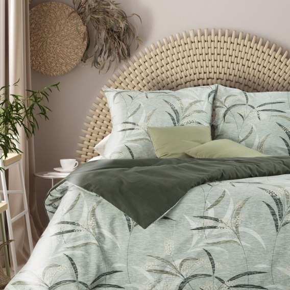 Komplet pościeli bawełnianej z recyklingu, z roślinnym nadrukiem szerokość: 220 cm, długość: 200 cm, kolor: oliwkowy, Gramatura: 115 GSM, Skład: 100% bawełna