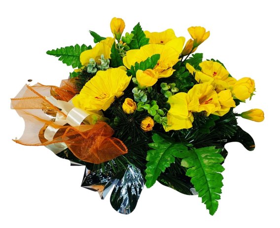Kompozycje nagrobne z wysokiej jakości sztucznych kwiatów i roślin.