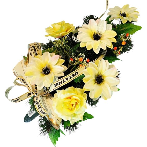 Nasz wieniec pogrzebowy cechuje się wyjątkowo gęstym splotem sztucznych gałązek iglastych, które tworzą estetycznie wyglądające tło dla unikalnej kompozycji kwiatów. Starannie dobrane kwiaty są niezwykle realistyczne i naturalne, dodając wiązance autentyczności i podkreślając jej uroczysty charakter.