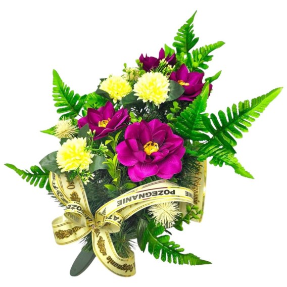 Nasz wieniec pogrzebowy cechuje się wyjątkowo gęstym splotem sztucznych gałązek iglastych, które tworzą estetycznie wyglądające tło dla unikalnej kompozycji kwiatów. Starannie dobrane kwiaty są niezwykle realistyczne i naturalne, dodając wiązance autentyczności i podkreślając jej uroczysty charakter.