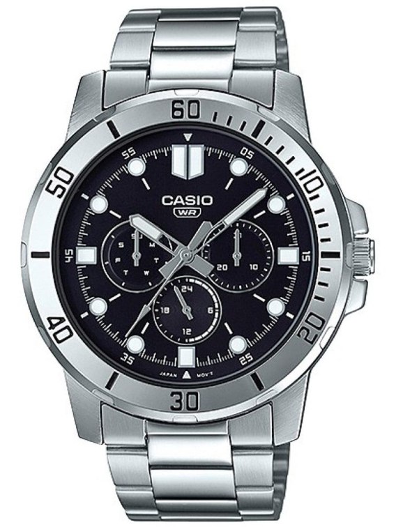 Zegarek męski CASIO MTP-VD300D-1E to doskonałe połączenie nowoczesnego designu i praktycznej funkcjonalności, które przypadnie do gustu każdemu miłośnikowi nowoczesnej elegancji. Jego okrągła, stalowa koperta w srebrnym kolorze nadaje mu wyjątkowego charakteru, a jednocześnie sprawia, że zegarek staje się uniwersalnym dodatkiem pasującym zarówno do codziennych stylizacji, jak i bardziej formalnych okazji. Tarcza zegarka, utrzymana w stonowanej, czarnej kolorystyce, została ozdobiona srebrnymi indeksami oraz smukłymi wskazówkami, które zapewniają doskonałą czytelność czasu. Chronografy umieszczone na tarczy dodają całości nuty dynamizmu i nowoczesności.