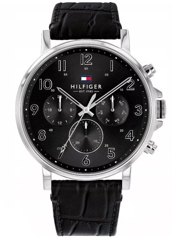Tommy Hilfiger Daniel 1710381 to stylowy zegarek męski, który łączy klasyczny design z funkcjonalnością. Model ten wyróżnia się okrągłą kopertą wykonaną z trwałej, nierdzewnej stali szlachetnej pokrytej srebrzystą powłoką. Kompozycję dopełnia czarny skórzany pasek z naturalnej skóry oraz dopasowana kolorystycznie tarcza, zabezpieczona mineralnym szkłem o twardości 5/10 w skali Mohsa. Wśród praktycznych dodatków znajdują się datowniki wskazujące dzień tygodnia i miesiąca, a także wskaźnik 24-godzinny. Zegarek posiada wodoszczelność na poziomie 50 metrów, co pozwala na bezpieczne użytkowanie go podczas codziennych czynności, takich jak prysznic czy mycie auta.