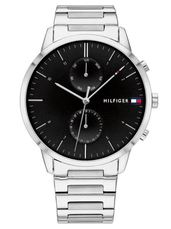 Zegarek męski Tommy Hilfiger Hunter 1710407 to model kwarcowy zasilany baterią, który charakteryzuje się eleganckim designem. Posiada okrągłą kopertę ze stali szlachetnej w srebrnym kolorze, w której znajduje się czarna tarcza z sub-tarczami datowników dni tygodnia oraz miesiąca. Indeksy i wskazówki na tarczy zapewniają łatwość odczytu. Zegarek jest doskonałym wyborem do codziennego użytku, a jego srebrna stalowa bransoleta z pewnością przyciągnie wzrok. Wodoszczelność na poziomie 30 m oznacza, że zegarek jest odporny na zachlapania, takie jak podczas mycia rąk.