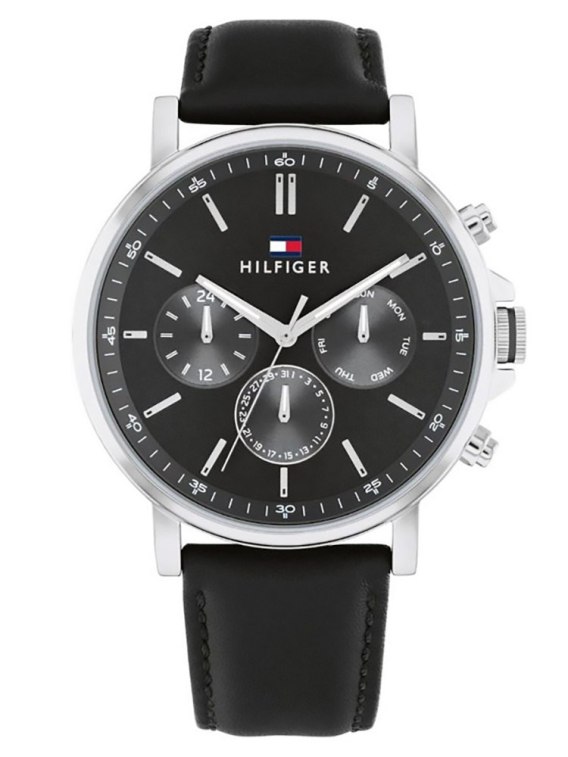 Zegarek męski TOMMY HILFIGER TYSON 1710586 to eleganckie połączenie czerni i srebra. Koperta wykonana z wysokiej klasy stali szlachetnej 316L w kolorze srebrnym, odpornej na korozję oraz hipoalergicznej. Pasek zegarka w kolorze czarnym wykonany został ze skóry naturalnej. Na czarnrj tarczy, ze szlifem słonecznym, znajdują się subtarcze wskazujące: dzień miesiąca, dzień tygodnia oraz czas 24 godzinny. Całość chroniona szkłem mineralnym. Za odmierzanie czasu w zegarku Tommy Hilfiger 1710586 odpowiada mechanizm kwarcowy, do którego energia go zasilająca pochodzi z baterii. Model 1710586 posiada wodoszczelność na poziomie 5ATM co czyni go w niewielkim stopniu odpornym za wodę. Całość dopracowano w najdrobniejszym szczególe oraz zaprojektowano w zgodzie z aktualnymi trendami w modzie, otrzymując klasyczny, ale jakże elegancki zegarek.