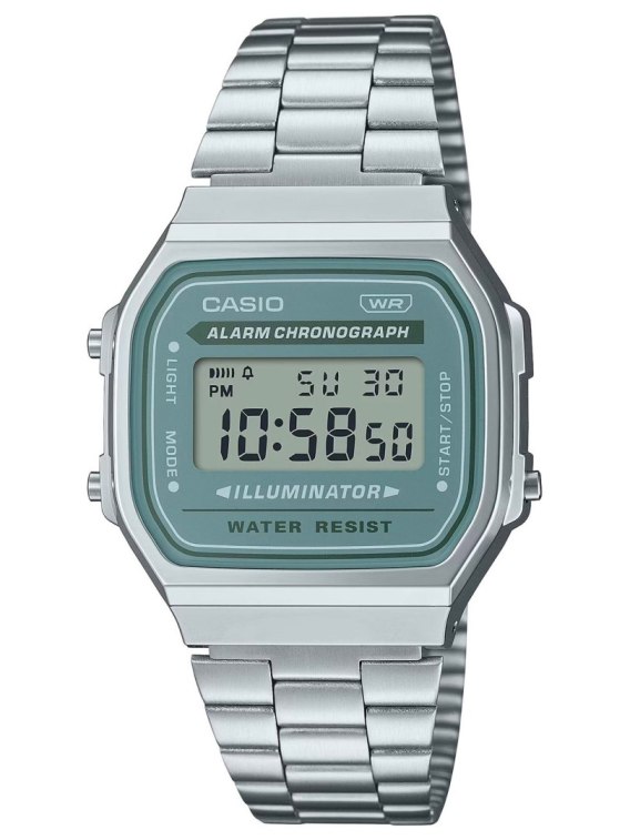 Casio A168WA-3A przyciąga wzrok swoim kultowym, retro designem. Srebrna, metalowa koperta o prostokątnym kształcie oraz charakterystyczny, metalowy pasek typu mesh nadają mu industrialnego, a zarazem eleganckiego wyglądu. Zielona tarcza z cyfrowym wyświetlaczem LCD tworzy harmonijną całość z resztą zegarka, która przywołuje klimat lat 80. To zegarek, który nie tylko pokazuje czas, ale także opowiada historię.