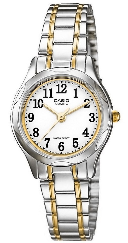 Śnieżnobiała tarcza z wyraźnymi, czarnymi cyframi to połączenie minimalizmu i elegancji, które sprawia, że zegarek jest niezwykle czytelny i funkcjonalny. Złote wskazówki oraz subtelne detale nadają mu szlachetnego charakteru, a lśniąca srebrno-złota bransoleta dodaje biżuteryjnego uroku, pięknie komponując się z każdym stylem. Smukła koperta, o subtelnie zaokrąglonych krawędziach, idealnie dopasowuje się do kobiecego nadgarstka, podkreślając jego delikatność i wdzięk. Każdy detal tego zegarka marki CASIO został zaprojektowany z myślą o kobiecej delikatności i klasycznym pięknie.