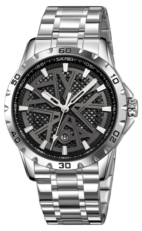 Zegarek Skmei 9337 to czysta, męska elegancja z pazurem - przyciąga uwagę wyrazistą, ale zarazem subtelną kolorystyką. Srebrna koperta i bransoleta tworzą solidną, klasyczną podstawę, która idealnie kontrastuje z trójwymiarową tarczą w odcieniach stalowej szarości. Taka tarcza z elementami 3D dodaje głębi i charakteru, a srebrne, fluorescencyjne indeksy i wskazówki sprawiają, że zegarek pozostaje czytelny o każdej porze.
