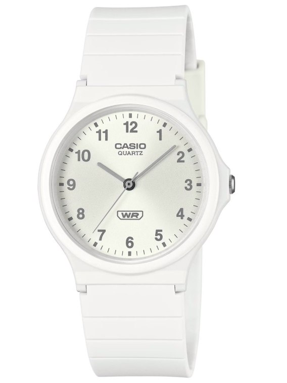 Zegarek damski CASIO MQ-24B-7BD to prawdziwe ucieleśnienie prostoty i lekkości. Ten model zachwyca swoją minimalistyczną formą, która doskonale wpisuje się w codzienne stylizacje, dodając im odrobiny sportowego wdzięku. Jego okrągła, wytrzymała koperta z tworzywa sztucznego w białym odcieniu prezentuje się niezwykle oryginalnie, a jednocześnie pozostaje uniwersalna, pasując do różnych stylów - od casualowych po bardziej sportowe. Tarcza zegarka, utrzymana w srebrnej kolorystyce, została ozdobiona delikatnymi, indeksami w szarym kolorze oraz smukłymi wskazówkami, które zapewniają doskonałą czytelność czasu. Brak zbędnych ozdób sprawia, że zegarek wygląda nie tylko stylowo, ale także niezwykle świeżo i nowocześnie.