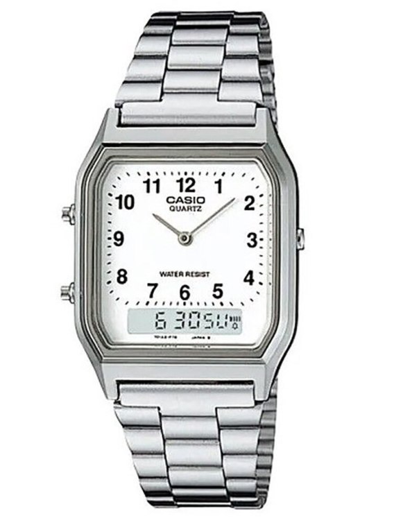 Zegarek wyróżnia się smukłą, srebrną kopertą ze stali szlachetnej oraz minimalistyczną tarczą w kolorze białym z czarnymi wskazówkami. Uniwersalny design sprawia, że pasuje zarówno do codziennych, jak i bardziej formalnych stylizacji. Duży, czytelny wyświetlacz cyfrowy z datownikiem harmonijnie łączy się z analogowymi wskazówkami, dodając zegarkowi charakteru i funkcjonalności.