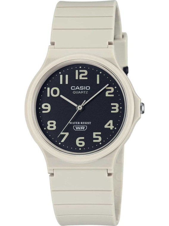 Zegarek damski CASIO MQ-24UC-8BDF to prawdziwe ucieleśnienie prostoty i lekkości. Ten model zachwyca swoją minimalistyczną formą, która doskonale wpisuje się w codzienne stylizacje, dodając im odrobiny sportowego wdzięku. Jego okrągła, wytrzymała koperta z tworzywa sztucznego w beżowym odcieniu prezentuje się niezwykle oryginalnie, a jednocześnie pozostaje uniwersalna, pasując do różnych stylów - od casualowych po bardziej sportowe. Tarcza zegarka, utrzymana w czarnej kolorystyce, została ozdobiona delikatnymi, indeksami w szarym kolorze oraz smukłymi wskazówkami, które zapewniają doskonałą czytelność czasu. Brak zbędnych ozdób sprawia, że zegarek wygląda nie tylko stylowo, ale także niezwykle świeżo i nowocześnie.