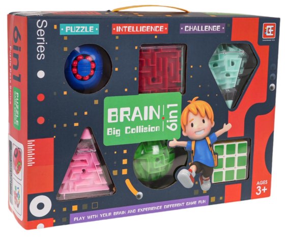Zestaw układanek logiczno-zręcznościowych, dla dzieci od 3-go roku życia. W zestawie znajduje się: kostka z labiryntem i kulką, owalny spinner z układanką i smyczką, 2 piramidki z labiryntem i kulką, kostka rubika i kula układanka. Zestaw ćwiczy cierpliwość i logiczne myślenie, wzmacnia koncentrację, pozwala pracować nad motoryką dłoni. Mały gabaryt zabawek sprawia, że zabawkę można zabrać wszędzie ze sobą i ćwiczyć np. na przerwie czy u lekarza.