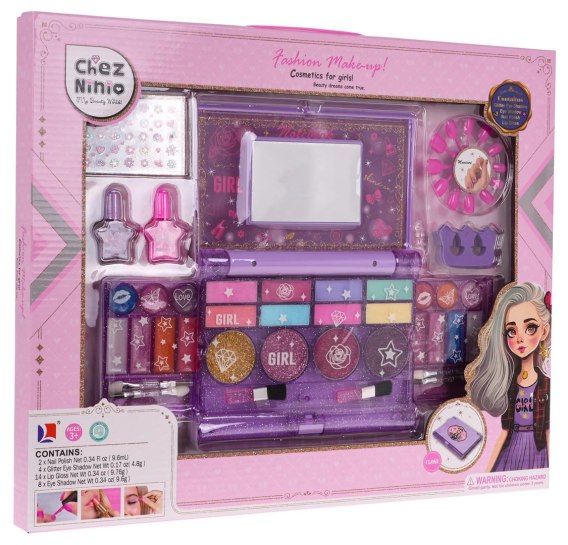 Zestaw do makijażu dla dzieci z rozkładanym tabletem i lusterkiem, powyżej 3-go roku życia. Zestaw zawiera wszystko, co niezbędne do malowania twarzy oraz paznokci. Wszystkie kosmetyki mieszczą się na palecie w zgrabnym, rozkładanym tablecie, wygodnym do przenoszenia. Paleta zawiera wiele różnokolorowych cieni i szminek oraz pędzelki do makijażu. Zestaw wykonany jest z bezpiecznych materiałów.