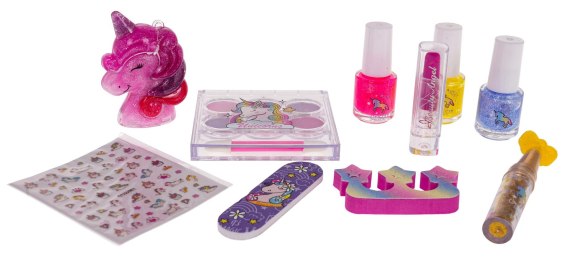 Zestaw do malowania paznokci i twarzy z jednorożcem dla dzieci od 3-go roku życia. W zestawie znajdują się 3 brokatowe lakiery do paznokci, szminka, aplikator z brokatem, pilnik do paznokci, separator do stóp, cienie do powiek z pędzelkiem, błyszczyk do ust w pudełeczku o kształcie jednorożca oraz naklejki na paznokcie. Wszystkie kosmetyki są bezpieczne dla dziecka i łatwo się je zmywa.