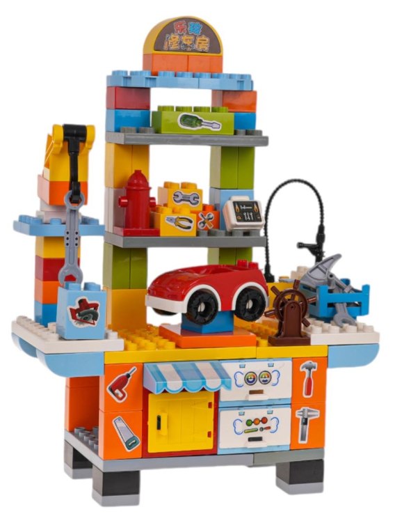 Kreatywny zestaw klocków konstrukcyjnych do budowy warsztatu samochodowego dla dzieci od 3-go roku życia. Zestaw wykonany z najwyższej jakości plastiku w kolorowych barwach. Zestaw zawiera aż 110 elementów, pozwalających na skonstruowanie funkcjonalnego warsztatu samochodowego z pojazdem, narzędziami i sprzętem naprawczym. Wśród sprzętu warsztatowego dzieci odnajdą m.in. takie narzędzia jak śrubokręty czy klucz francuski, a także maszynę do pompowania kół i podnośnik. Zestaw zachęca do kreatywnej zabawy i uczy rozwiązywać problemy.