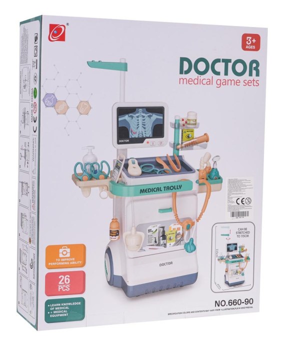 Interaktywny, bogato wyposażony zestaw lekarski z efektami dźwiękowymi i świetlnymi, dla dzieci od 3-go roku życia. Zestaw składa się z solidnie wykonanego, lekkiego wózka, z dużymi kółeczkami i poręcznym uchwytem i mnóstwa narzędzi lekarskich. Możemy wymieniać zdjęcia RTG, na ekranie monitorującym za pomocą przycisków można aktywować odgłosy bicia serca, czy alarmu. Panel monitorujący zasilany jest bateriami typu 2 X AA 1,5 V (brak w zestawie). Stetoskop posiada odgłosy bicia serca a termometr odgłos mierzenia temperatury i podświetlenie. Stetoskop i termometr zasilane są bateriami łącznie 3 x AG10 1,5 V (w zestawie)