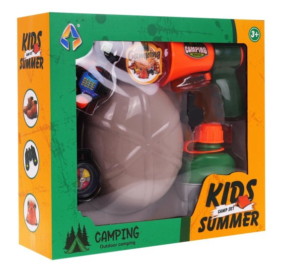 Zestaw małego odkrywcy dla dzieci od 3-go roku życia. Zestaw wyposażono w kapelusz, manierkę na wodę, megafon, zegarek, kompas oraz gwizdek. Megafon zasilany jest bateriami typu 2 x AA 1,5 V (brak w zestawie). Posiada nagłośnienie oraz czerwoną diodę.