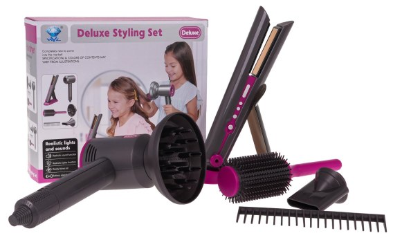 Bogato wyposażony, interaktywny zestaw małej fryzjerki dla dzieci od 3-go roku życia. Zestaw wykonano z dbałością o szczegóły. Znajduje się tutaj suszarka z wymiennymi dyszami, dyfuzorem i nasadką skupiającą, prostownica do włosów, grzebień, szczotka do włosów oraz stojak na prostownicę. Suszarka zasilana jest bateriami typu 2 x AA 1,5 V (brak w zestawie), prostownica bateriami typu 2 x AA 1,5V(brak w zestawie). Suszarka wydaje odgłosy charakterystyczne dla suszenia i posiada delikatny nawiew. Prostownica do włosów, po włączeniu świeci światełkami i wydaje odgłosy charakterystyczne do prostowania włosów.